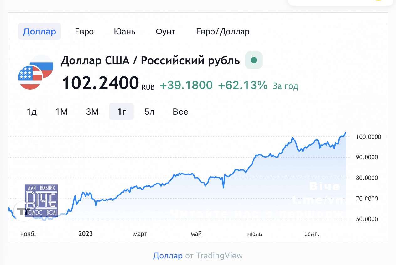 Курс долара на Московській біржі на деякий час перевищив 102 рубль. Євро торгується вище 107 рублів. Російська валюта слабшає, незважаючи на нафту, що дорожчає на тлі війни Ізраїлю і ХАМАС.