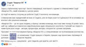 Кварталівці закликають “не використовувати бренд «Квартал 95» у спекулятивних чи політизованих контекстах”.